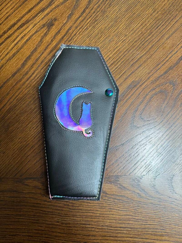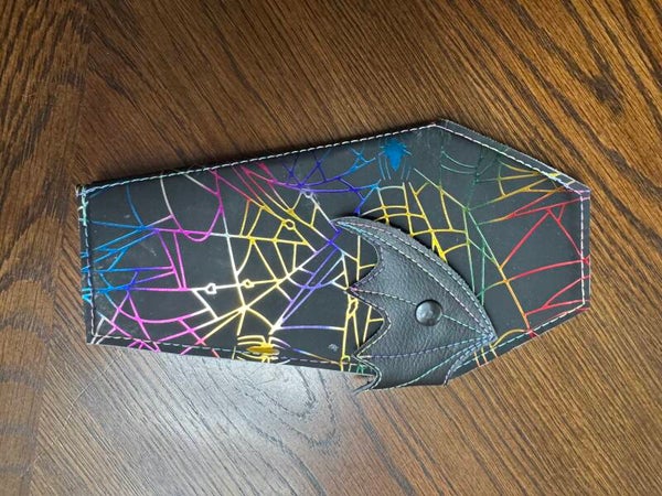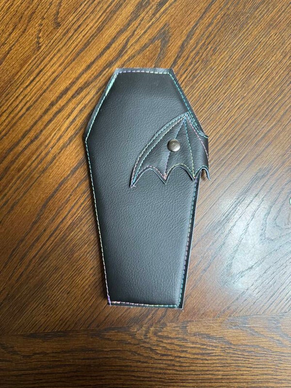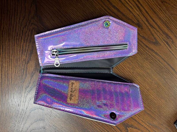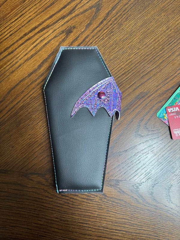 These cute little coffins consist of 8 card slots, 2 cash slots, and a zippered pocket.